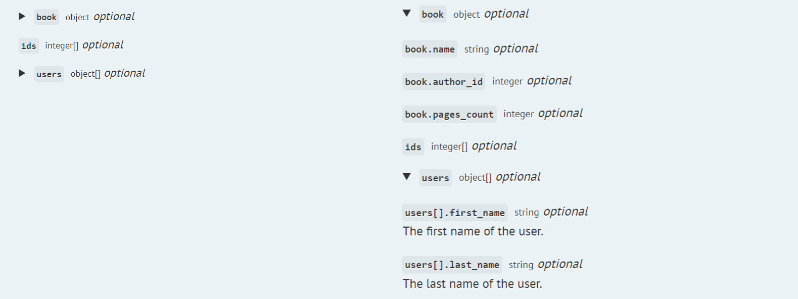 The old dot notation syntax was based on Laravel's validation syntax. However, it had a few limitations in our case. It was based on PHP semantics (for instance, JSON objects are PHP arrays), which meant it didn't fit well for documenting types. It was also unclear whether you needed or were able to document parent fields as well as individual fields.