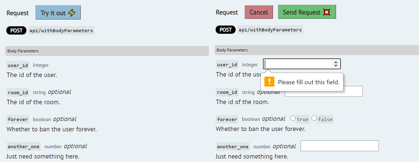 Note that the new syntax only applies to docblocks. If you're using FormRequest validation rules, you don't need to worry about the parameter format. Scribe will transform those appropriately.