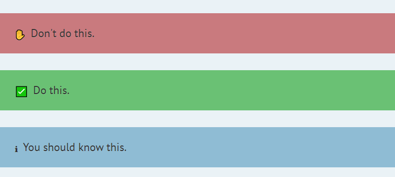 You can add little highlighted warnings and notes using the <aside> tag and either of the classes notice, warning, or success.